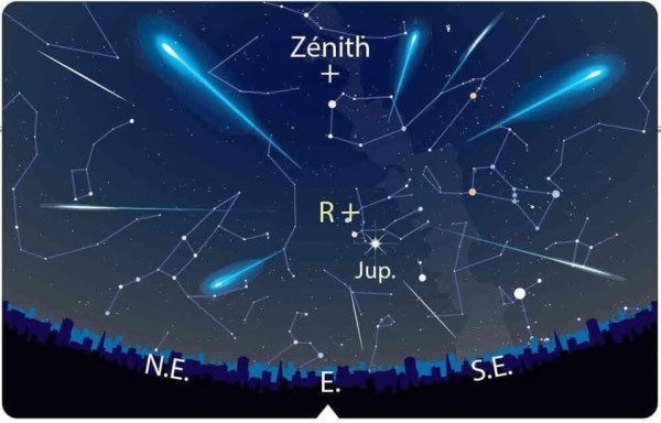 Une pluie d’étoiles filantes sera à son plein potentiel dans la nuit du 13 au 14 décembre. Selon le secteur, vos yeux pourraient observer environ 120 météores par heure !Le radiant (R), le point d'où semblent provenir les météores, se situe dans la constellation des Gémeaux, proche cette année de la brillante planète Jupiter.