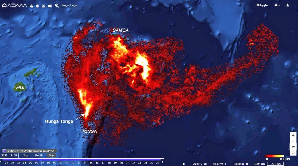 les deux îles de Hunga Tonga et Hunga Ha’apai sont les parties émergées de son cratère.