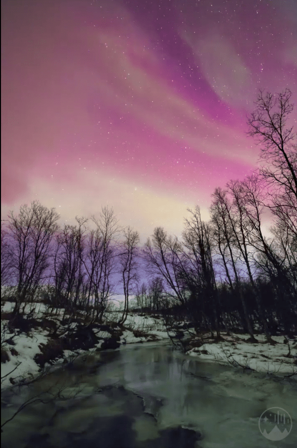 Quand les atomes d’azote retrouvent leur état d’origine, ils émettent une lumière aux teintes violettes. Il est très rare d’assister à une aurore violette, cela n’arrive que lors de période de très forte activité solaire.