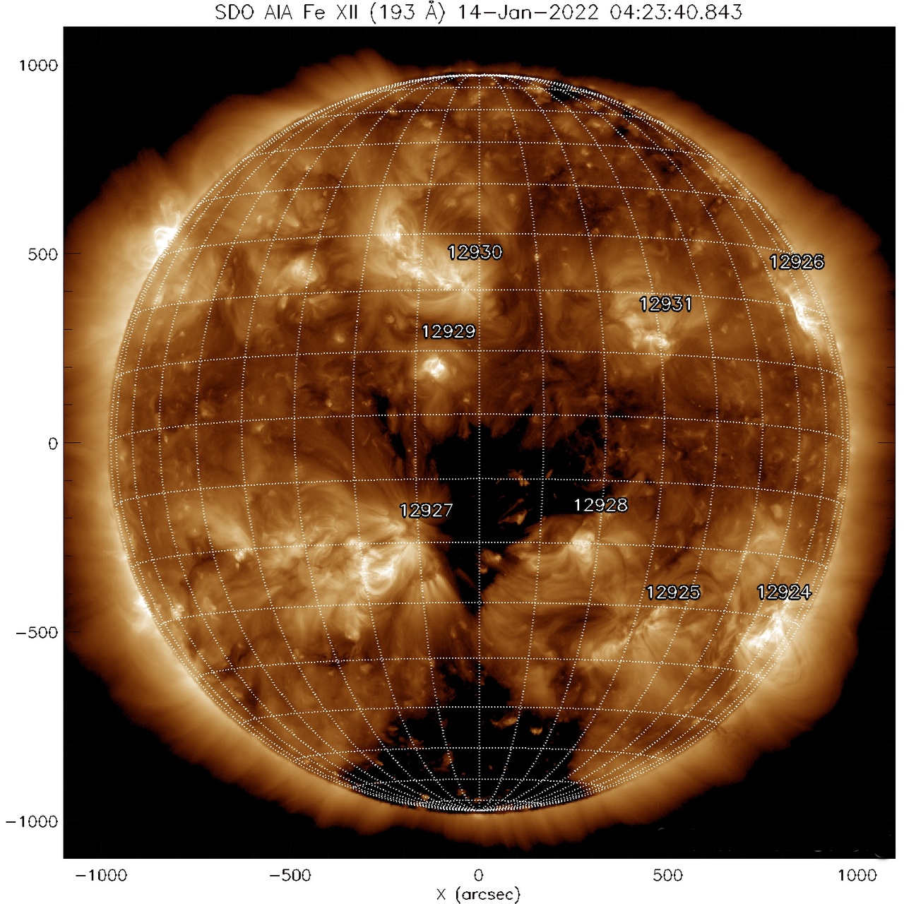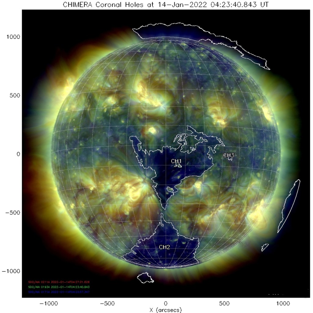 Le vent solaire provenant de ce trou coronal sud situé face à la Terre , atteindra Gaia les 16 et 17 janvier 2022