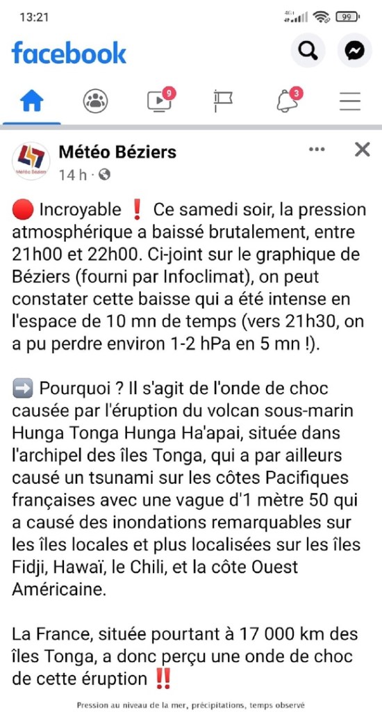 L’onde de choc de l’éruption du volcan Hunga Tonga-Hunga Ha’apai dans l’archipel de Tonga à17 000 km s’est propagé jusqu’à la France hier en cours de soirée avec deux variations de pression bien visibles sur la station de Paris Saint-Germain-des-Prés.