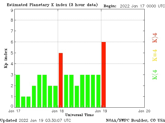indice KP6 , ça veut dire que les aurores ‘ énergies cosmiques et Solaires ) vont descendre dans des latitudes plus basses , en dessous de l’écosse elles peuvent être observées ..