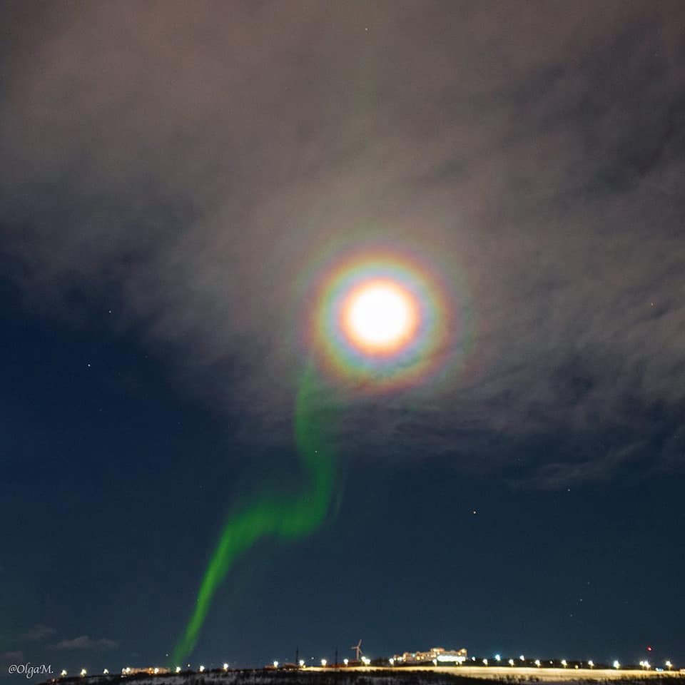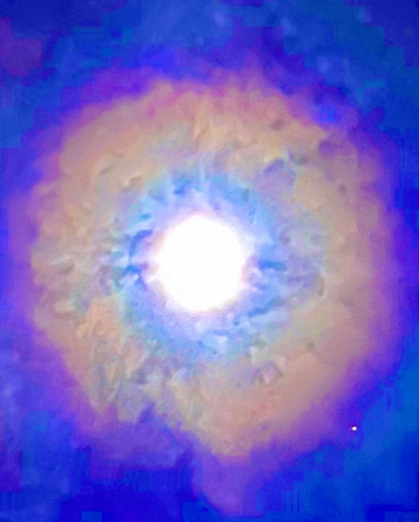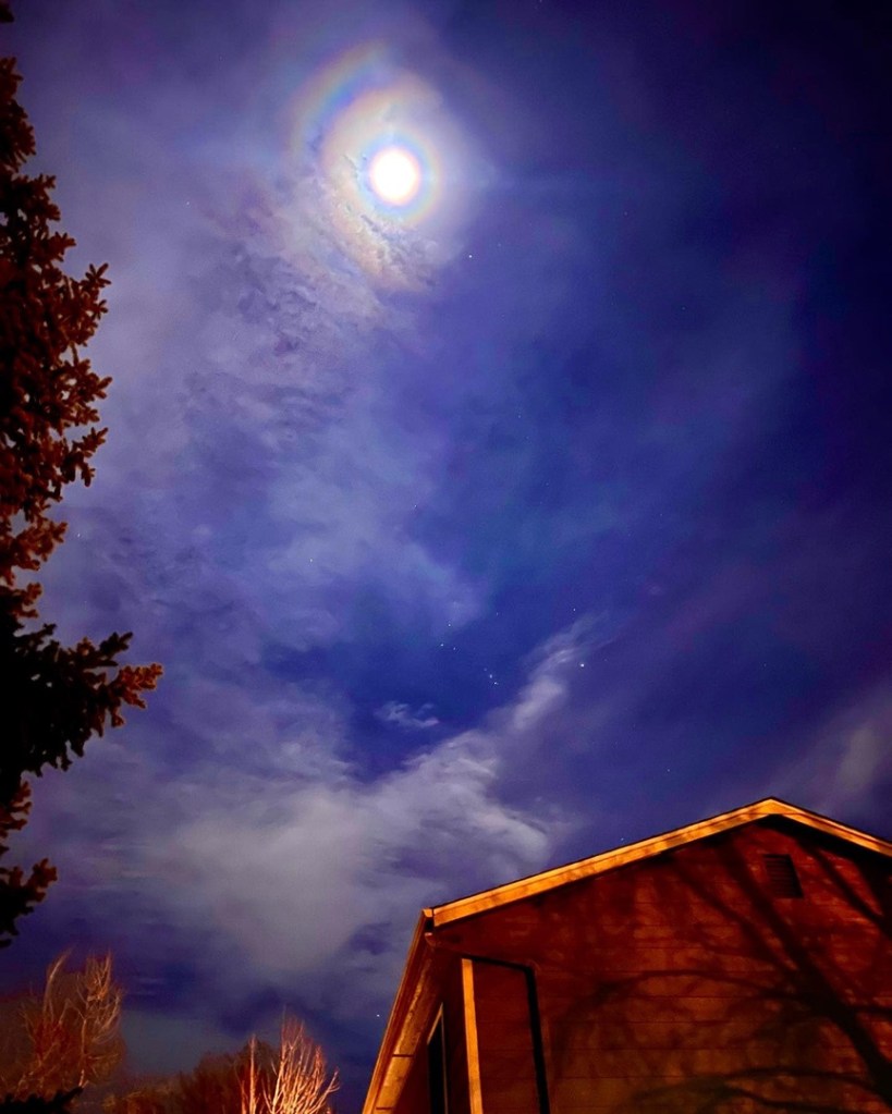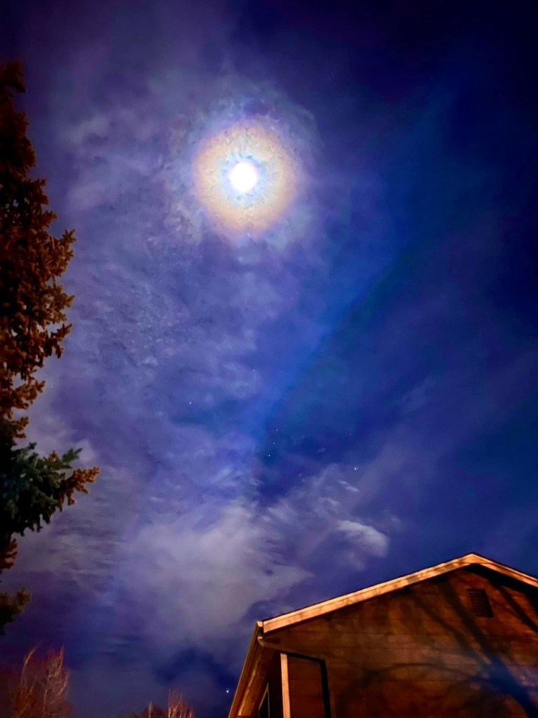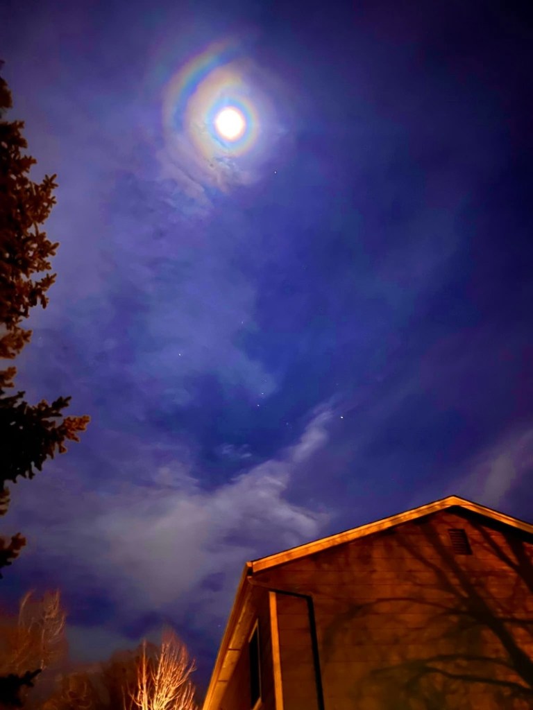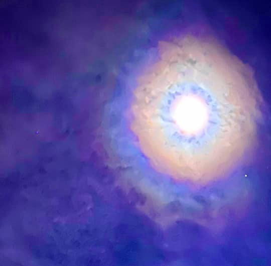 un halo coronal lunaire irisé dû à l’intensité grandissante de la lumière solaire reflétée et à la présence de cristaux de Glace qui se déversent de plus en plus dans l’éther , en ces temps..
