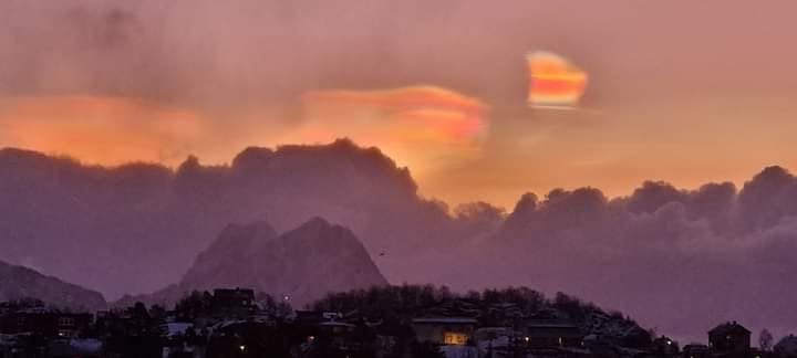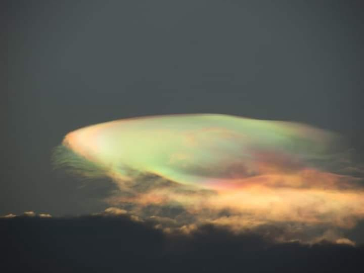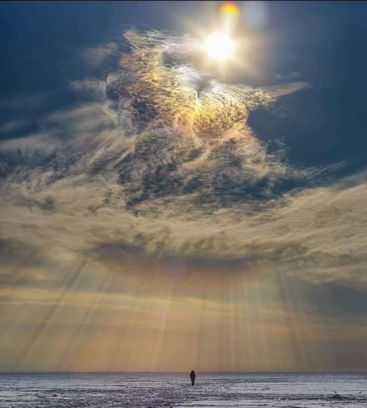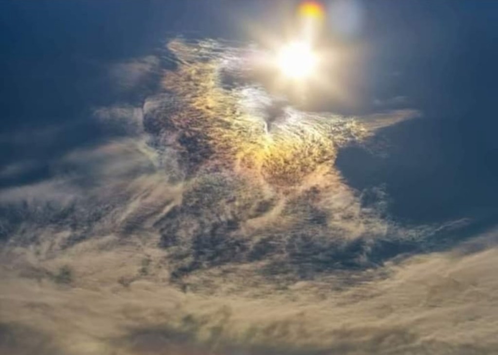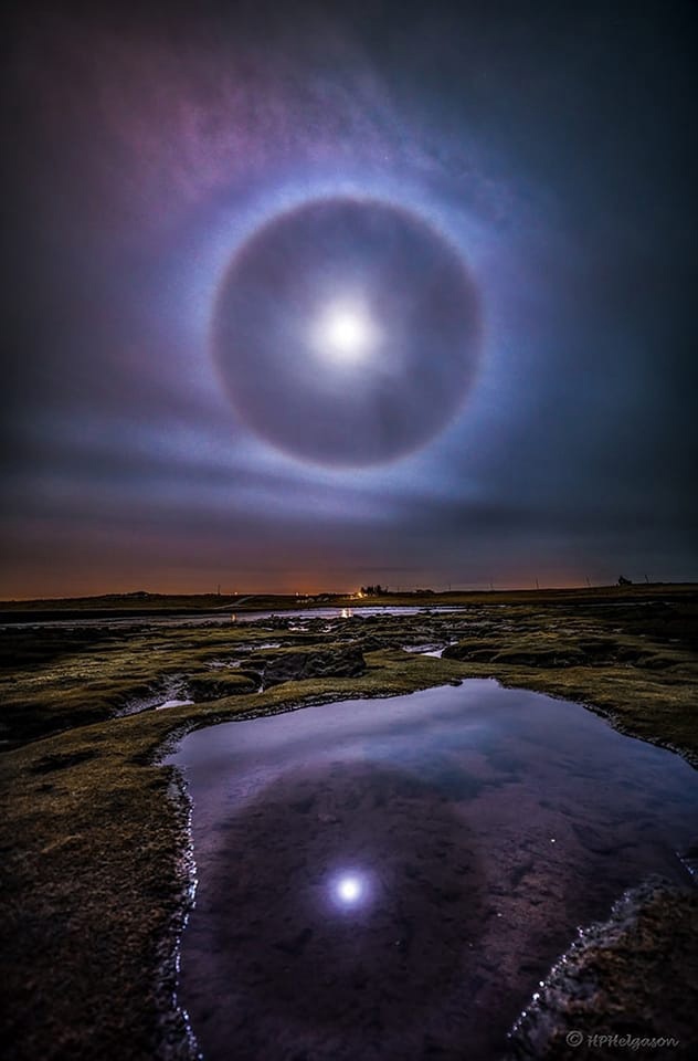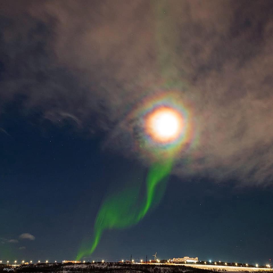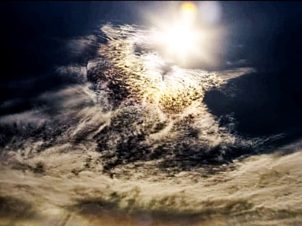 un halo coronal lunaire irisé dû à l’intensité grandissante de la lumière solaire reflétée et à la présence de cristaux de Glace qui se déversent de plus en plus dans l’éther , en ces temps..