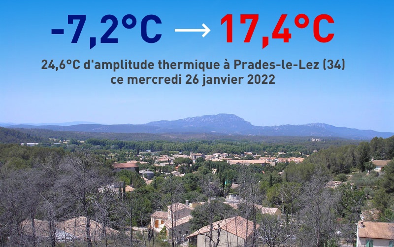 26.1/2022 À Prades-le-Lez dans l’ Hérault , le thermomètre est passé de -7,2°C ce matin à +17 ,4°C cet après-midi, une amplitude de 24,6°C