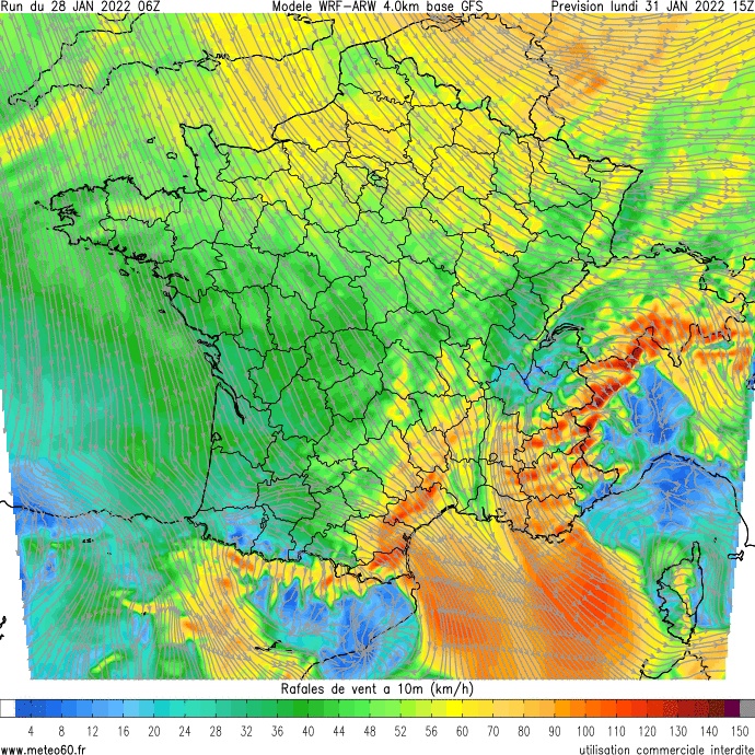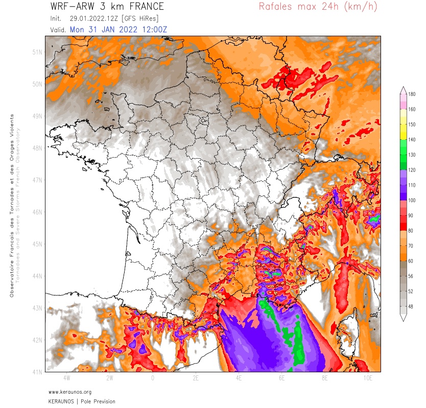 130 à 150 km/h entre l’Espinouse, le Larzac et l’Aigoual ! En PACA, des rafales jusqu’à 140 km/h sont probables en zone littorale.