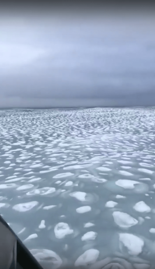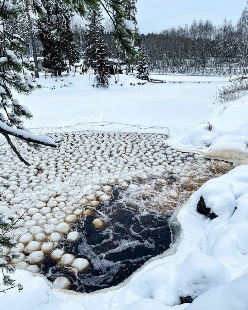 Des boules de glace (ou œufs) apparaissent progressivement dans l’eau froide. De petites mottes de boue de congélation se forment. Au cours du roulement de l »eau, leur taille augmente jusqu’à devenir de grosses boules de glace.