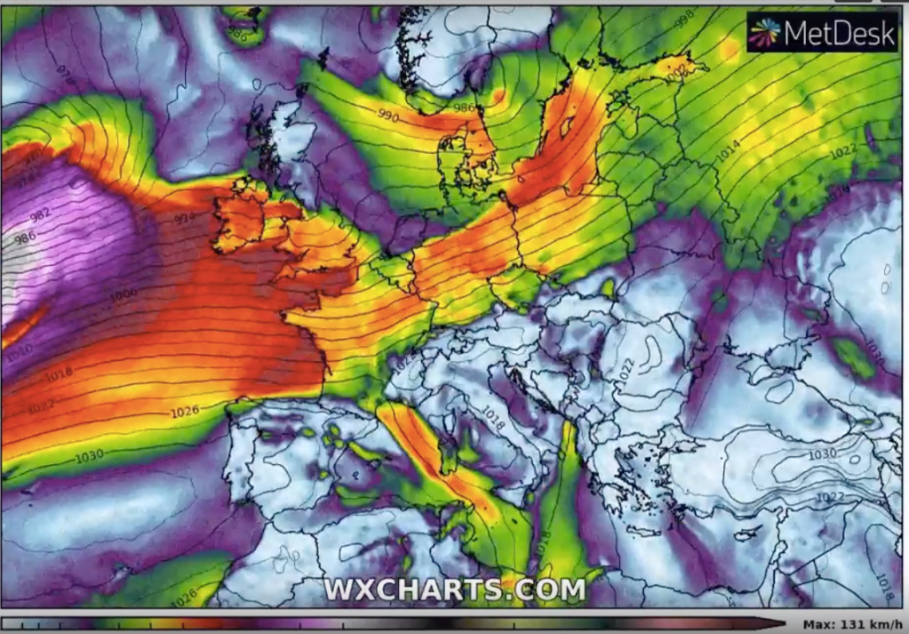 le Sud de l’Irlande et les Cornouailles vont être frappés par des vents pouvant dépasser les 170 km/h avant de traverser l’Angleterre et de progresser le long des régions côtières de l’Europe du Nord avec des vents de 140 à + de 150 km/h.