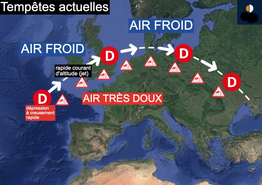 Les tempêtes actuelles qui se succèdent sont violentes , elles sont qualifiées de « bombes météorologiques » car elles sont liées à un conflit de masses d’air chaud / froid, occasionnant des dépressions à creusement rapide, « propulsées » par un très rapide courant d’altitude (lui-même issu d’un conflit thermique important).