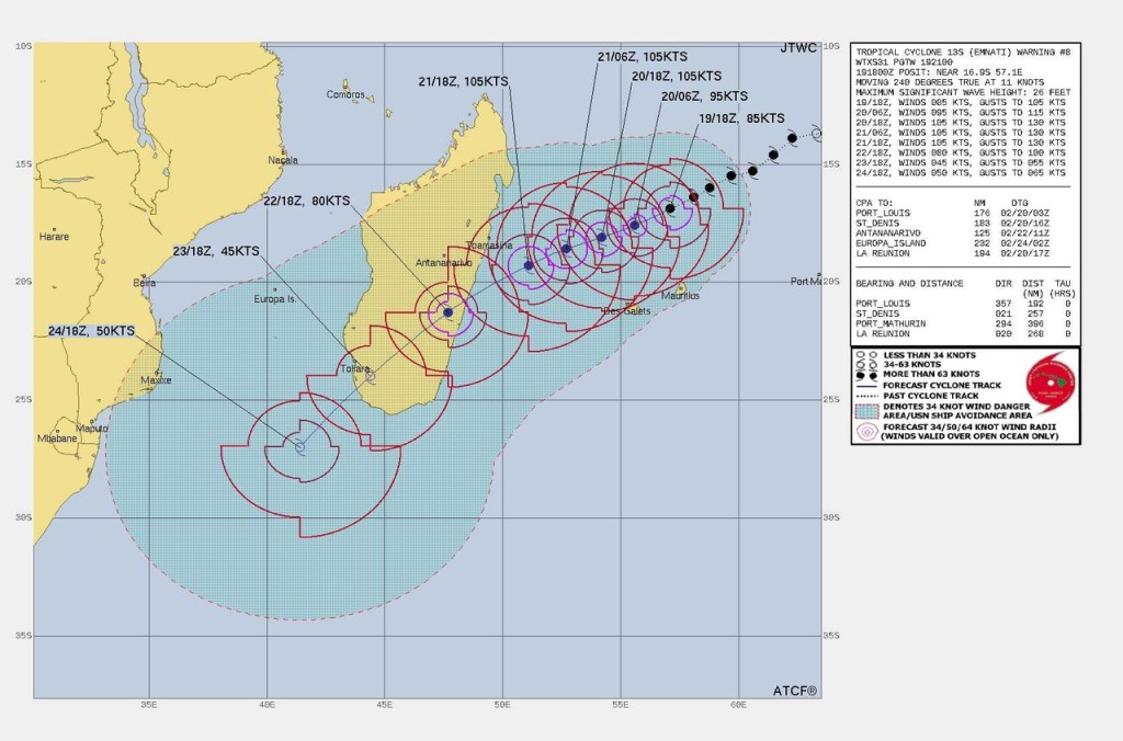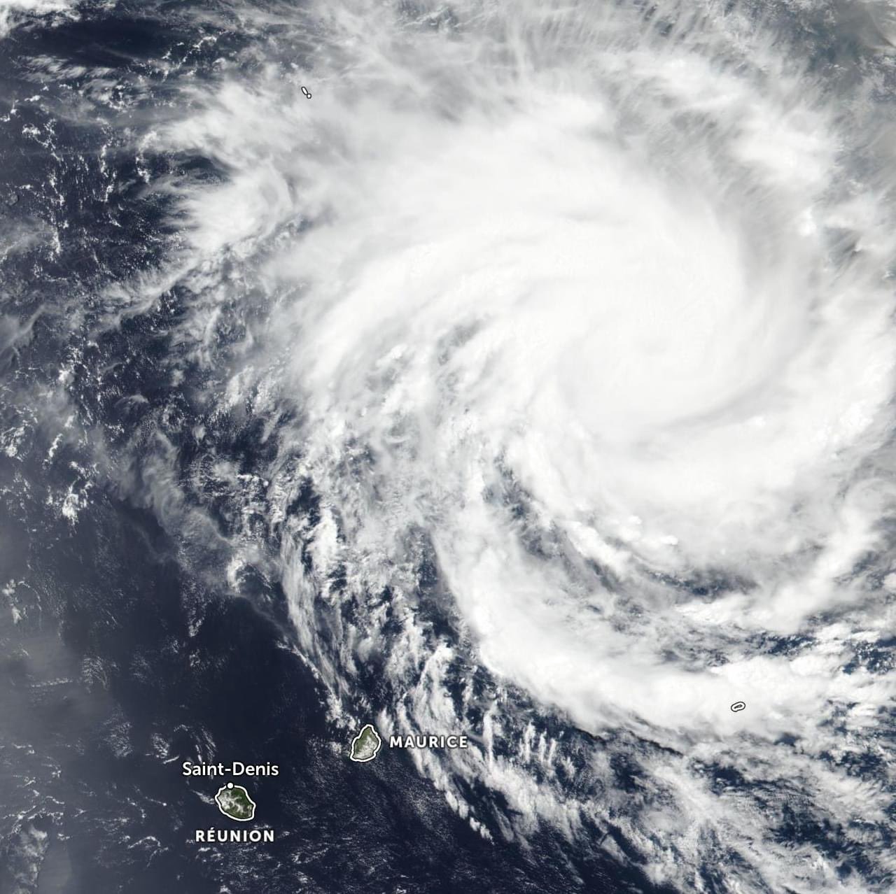 on peut voir sur la photo satellite , la petitesse des iles Maurice et de la Réunion , face au Monstre.. les trajectoires actuelles montrent qu’il va frapper Madagascar endeuillé récemment par le dernier Cyclone….