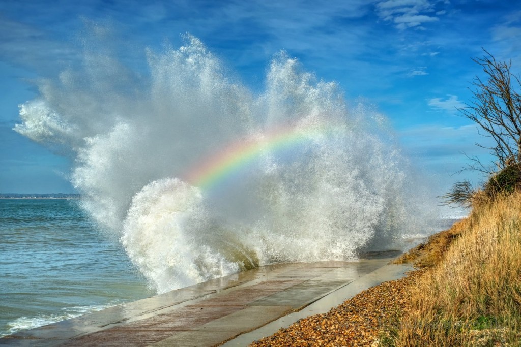 houle et vague arc-en-ciel sur la côte de Totland Bay, Royaume-Uni,