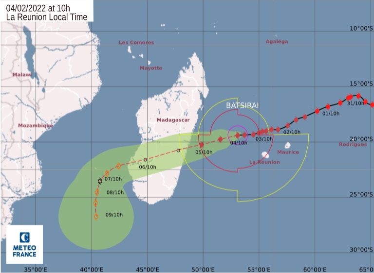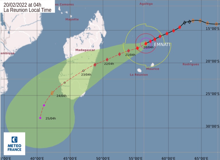 Il est actuellement un cyclone de catégorie 3 et n’atteindra probablement pas la catégorie 4, car les vents secs interdisent une intensification supplémentaire. L’atterrissage de Madagascar est attendu mardi après-midi, 22.2/2022 bien que les pluies et les vents puissent déjà affecter l’île.