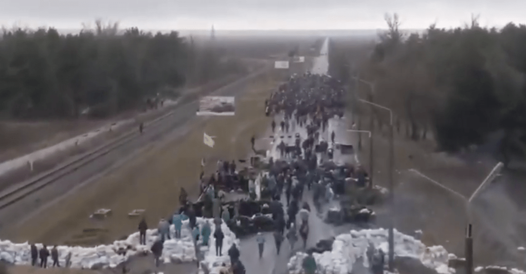 Plus tôt dans la soirée , en vidéo , on voit les habitants ériger des barricades pour empêcher les troupes russes de pénétrer dans la ville qui abrite la plus grande centrale..