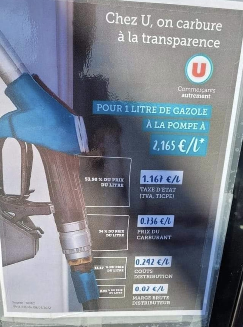 1,167 euro de taxe par litre , pour financer la Guerre et envoyer des armes à l’Ukraine , qui finance la Guerre en fait , avec tout ce qui augmente , l’électricité , le gaz , la nourriture…