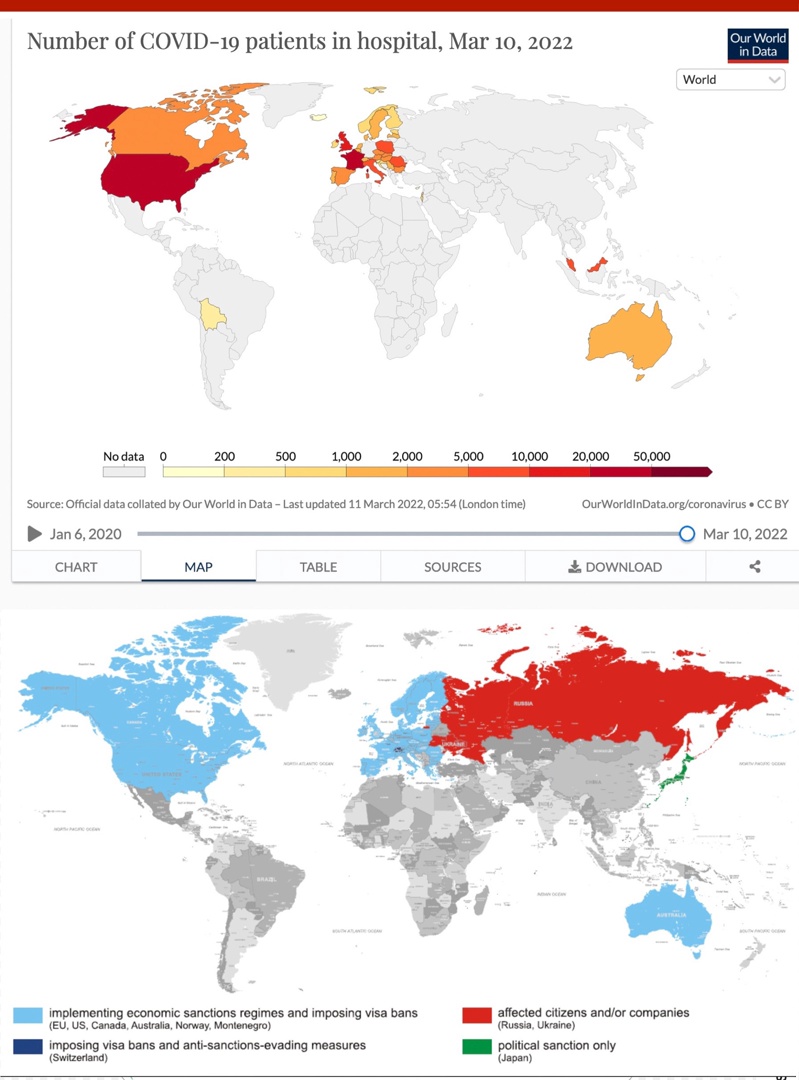 Les Pays qui signalent une remontée des cas de Covid, ( carte 1 en rouge ou orange ) sont les mêmes Pays ayant mis en place des sanctions contre la Russie, ( en bleu carte 2 )