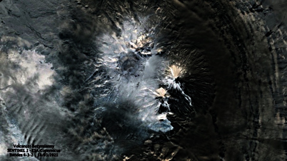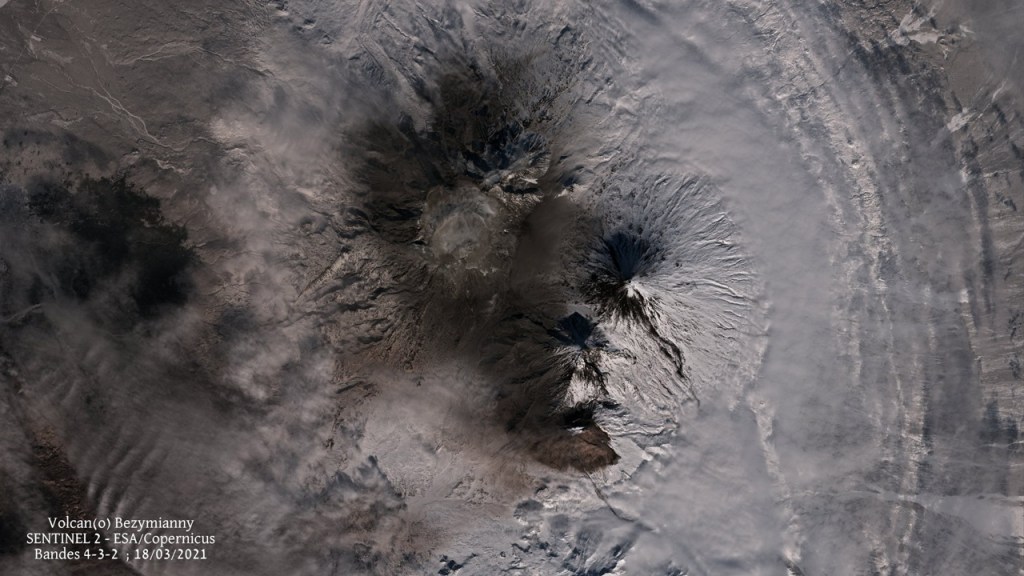 Cendres et Présence sur la neige après l’éruption du volcan Bezymyanny