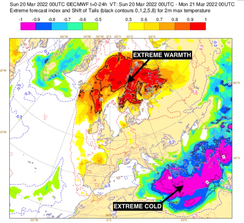 les principales zones de froid et de chaleur EXTREME en Europe.