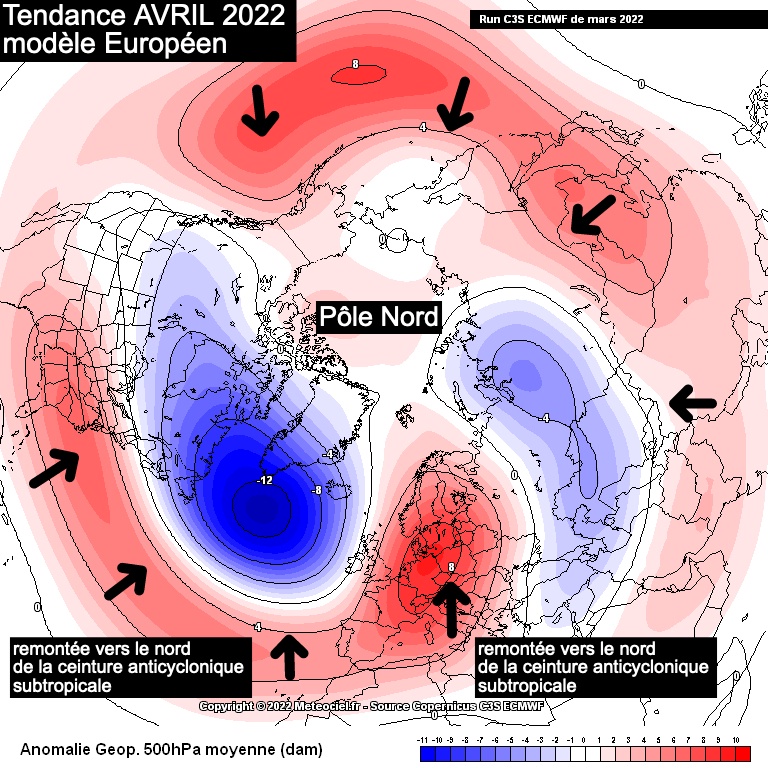 Les tendances d’anomalies de pression sur l’hémisphère Nord pour les prochains mois (surtout avril) doivent interpeller car elles confirmeraient la remontée vers le nord de la ceinture des anticyclones subtropicaux avec leurs vents … périodes calmes et sèches à nos latitudes.