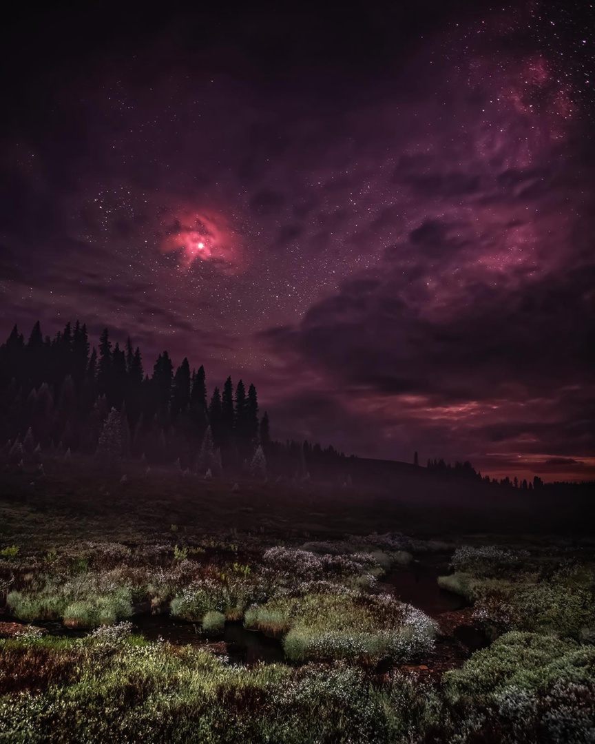 Mars s’élevant dans une atmosphère brumeuse alors que la Voie lactée lutte pour percer…