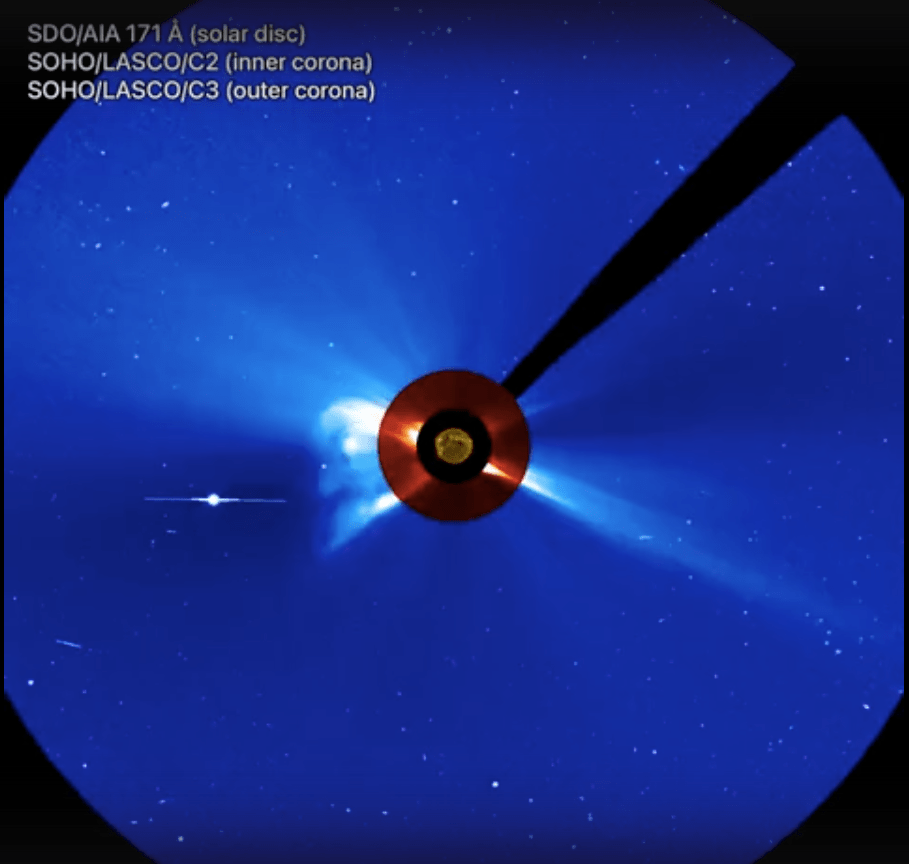 on voit la planète Jupiter traversée le champ de vision du télescope Lasco , elle est entrain de devenir un pulsar qui émet des rayonnements proche du Soleil.. Tout le système Solaire est en transformation..il est un TOUT..