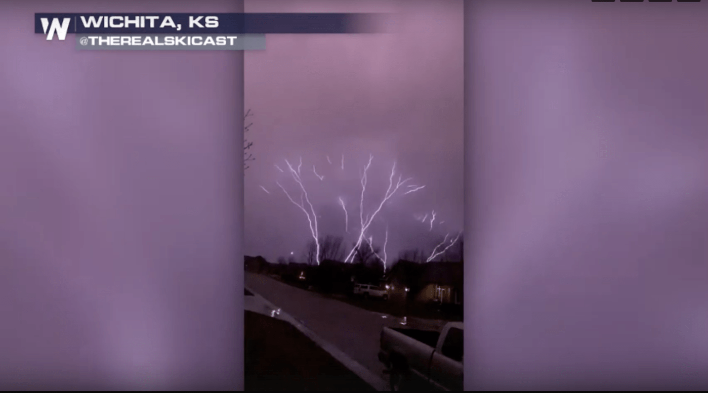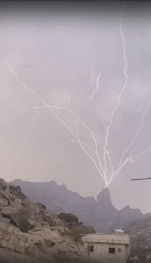 éclairs venant du sol dirigés vers le ciel et constituant des arbres de lumière..