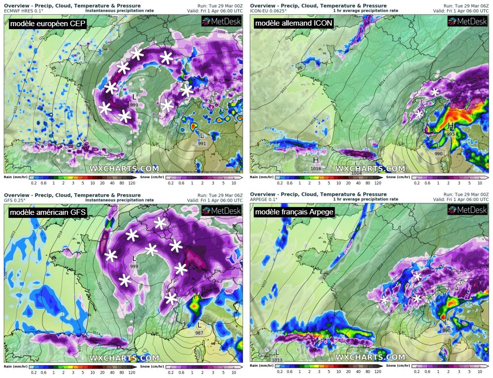 l’épisode de neige de jeudi-vendredi est soumis à de FORTES incertitudes. Deux scénarios s’opposent : un creusement dépressionnaire favorisant les chutes de neige ou une absence de creusement avec beaucoup moins de précipitations.