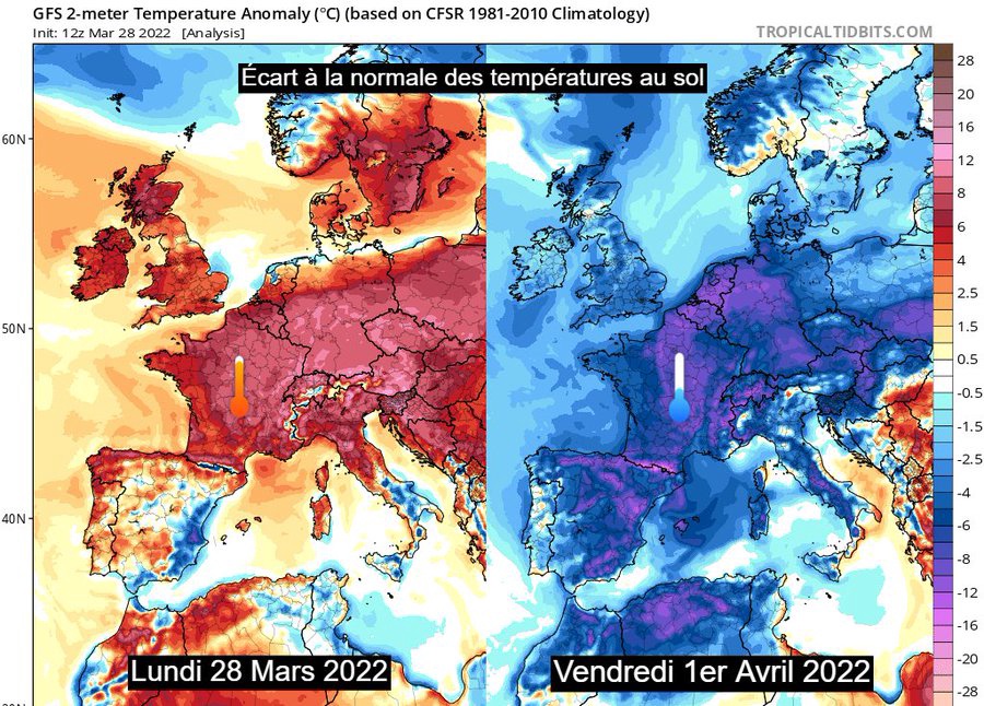 Nous allons passer d’un extrême à l’autre ! Alors que les températures étaient 6 à 10°C au dessus des normales lundi, elles seront souvent 6 à 10°C en dessous des normales vendredi !