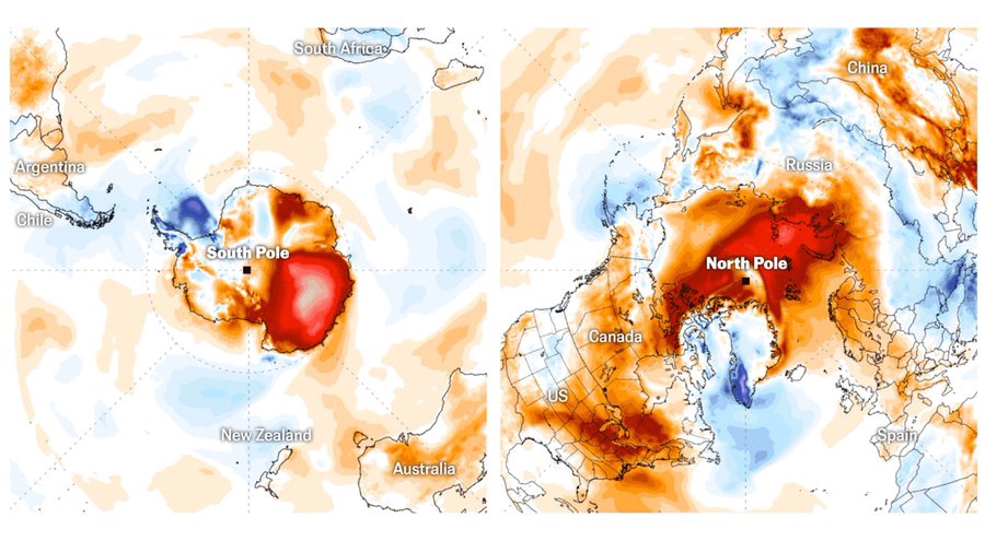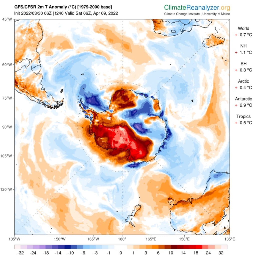 Et bien , une nouvelle vague de chaleur prévue la semaine prochaine en Antarctique.. supérieur de 30° au normal… des plateformes de la taille de Los Angeles qui retiennent la Mer intérieure , se sont détachées la semaine dernière..