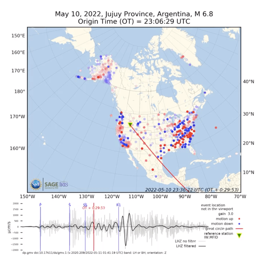 Les ondes ou vagues vibratoires du tremblement de terre M6.8 en Argentine traversant les stations sismiques en Amérique du Nord !