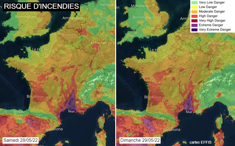 Le week-end du 28 et 29 mai 2022, le risque d’#incendies sera extrême en basse vallée du Rhône en raison des sols desséchés et du vent ! ( voir carte ) très chaude aussi la situation en Espagne..