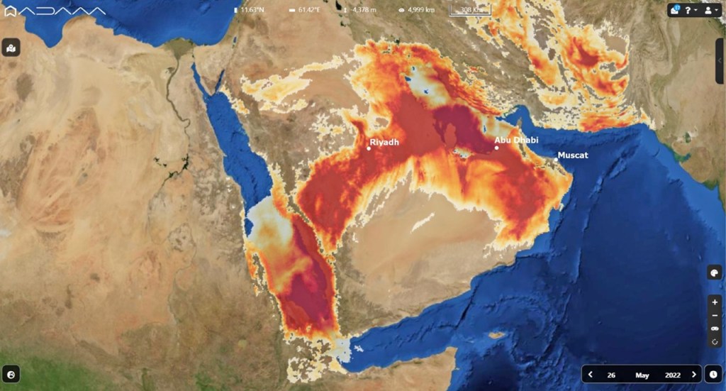 ..Fusion de deux tempêtes de poussière !26 mai 2022 , Le satellite Sentinel 5 a détecté un panache massif au-dessus du Koweït , du Qatar et d’une partie du Moyen-Orient et le nuage de poussière saharienne se dirigeant vers Suez .