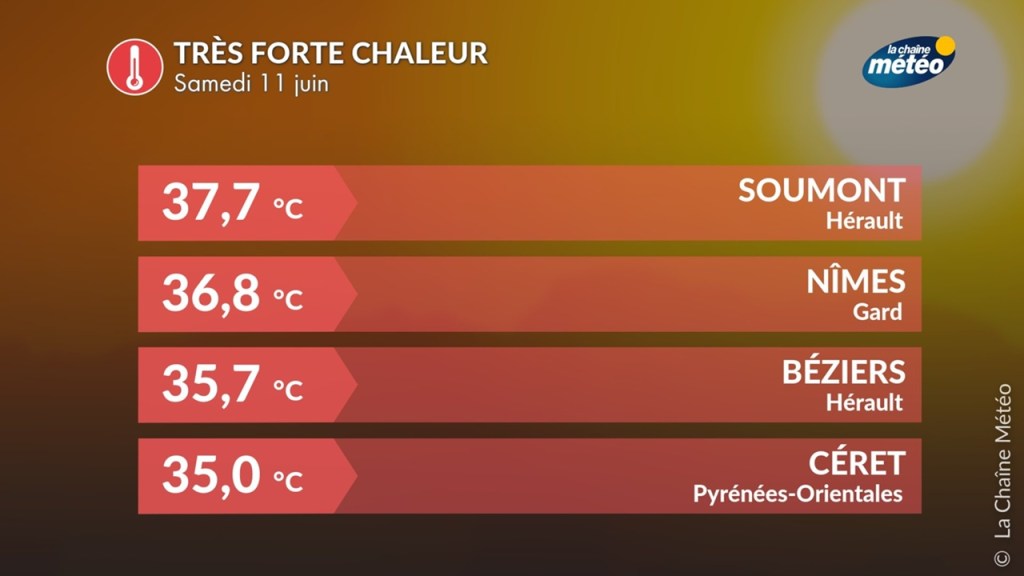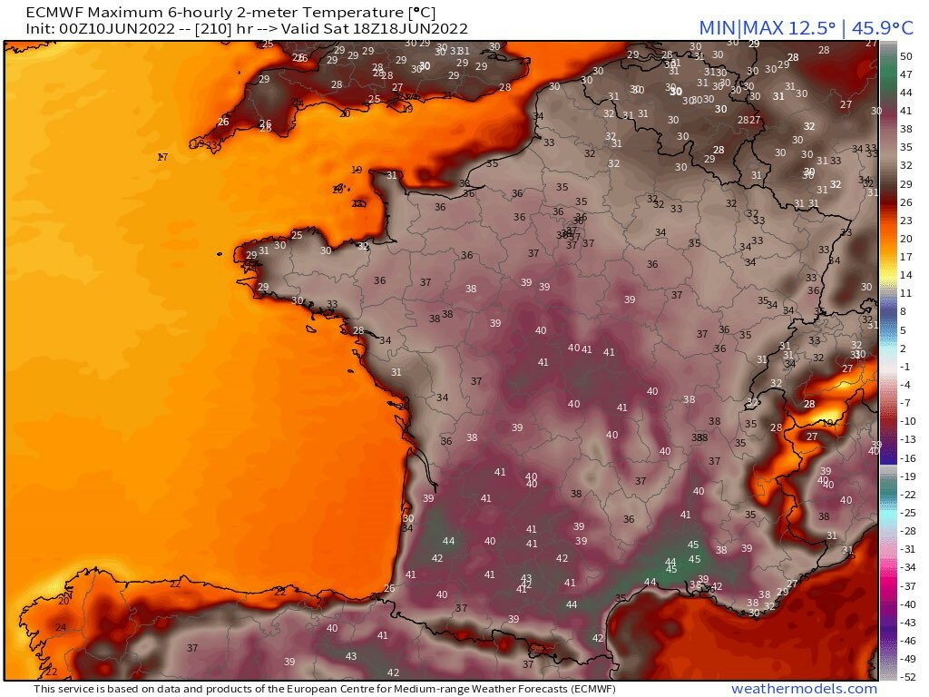 même la carte des estimations de la chaîne météo en partage ci dessous , semble mesurée , sur d’autres modèles ( en partage ) , on monte à 44° , 45° ce qui semble pas impossible vu que la canicule n’est pas encore là , et que déjà dans l’Hérault , on était ce samedi à des températures de 37.7 , une fièvre légère pour l’Homme… une fébricule..