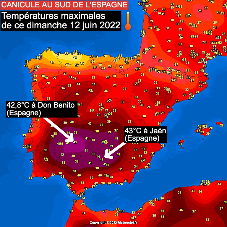 La canicule s’intensifie dans le Sud de l’Espagne où ce dimanche, 12 Juin 2022 il a été enregistré 43°C à Jaén (Andalousie)