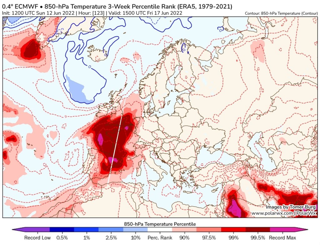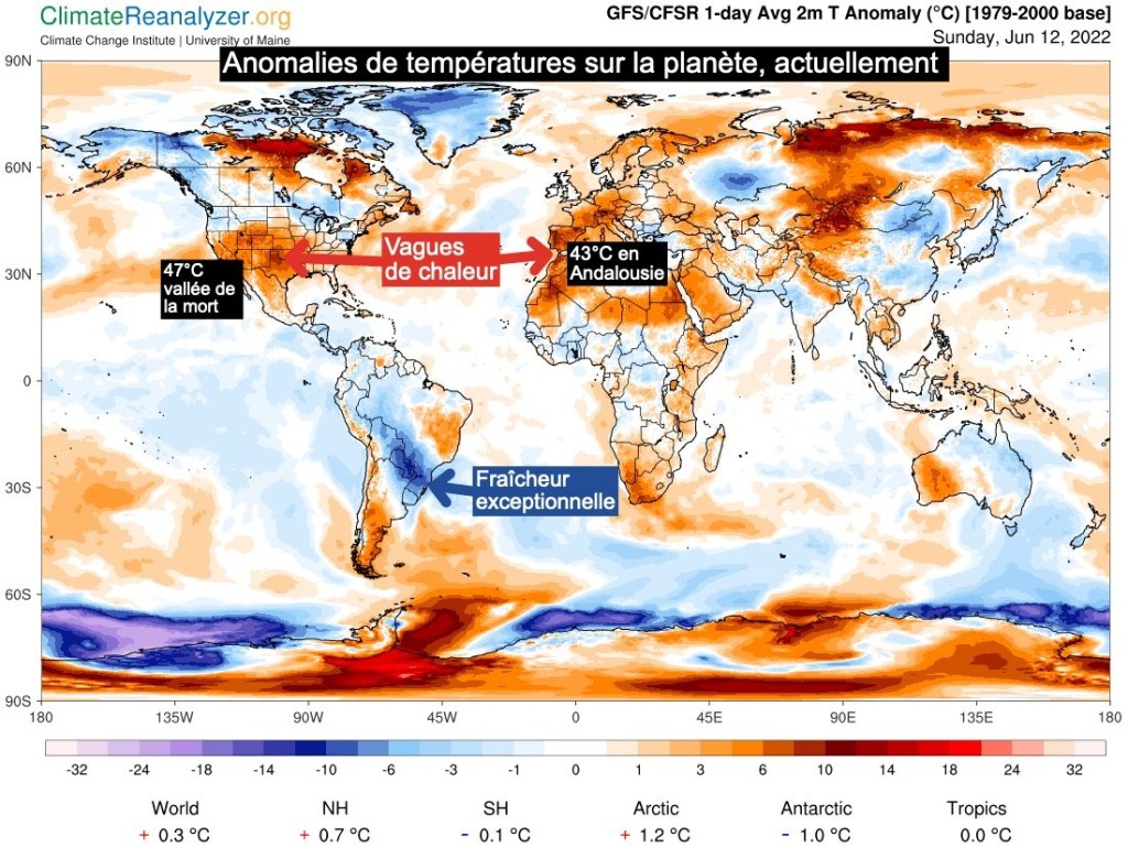 Les fortes chaleurs et la canicule de cette semaine sont liées à une goutte froide qui joue le rôle de pompe à chaleur en advectant de l’air brûlant venu d’Afrique du nord sur la France et l’Espagne..