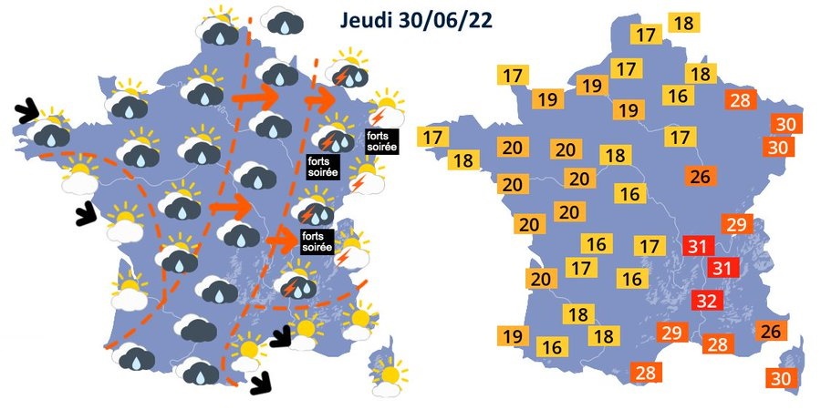 Demain jeudi 30 juin, une perturbation océanique va s’enfoncer sur la France avec seulement 16 à 19°C du sud-ouest à la Belgique. À l’avant, il fera chaud dans l’est où de forts voir violents orages sont à craindre en fin de journée.
