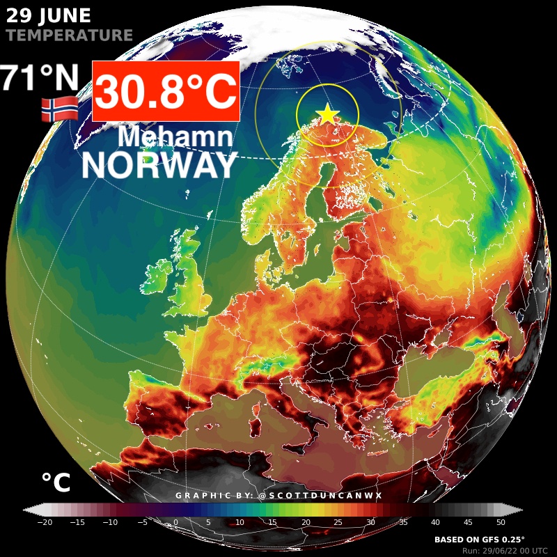 Norvège 30.8° Cette station météo au sommet de la Norvège arctique vient d’atteindre +30,8°C (87,4°F) et a pulvérisé le record mensuel de juin de 5° qui s’élevait auparavant à +25,4°C