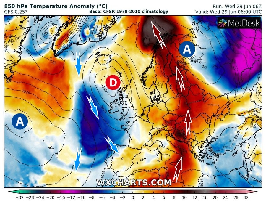 L’air frais venu du Groenland plonge jusqu’au Portugal tandis que l’air très chaud s’élève du Maghreb jusqu’au nord de la Scandinavie !