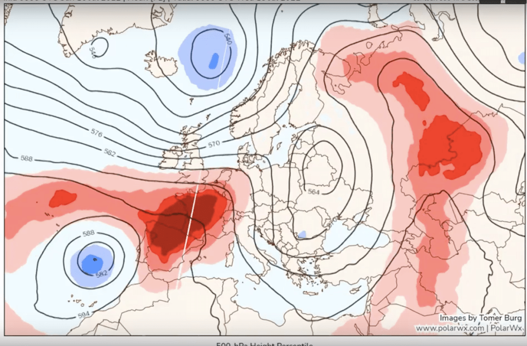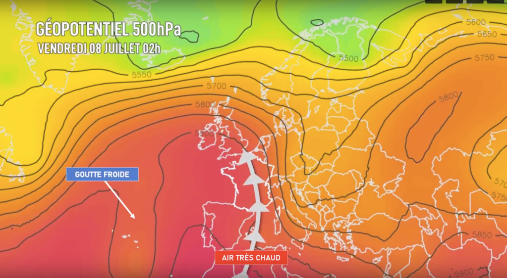 en premier lieu un blocage anticyclonique , avec une goutte froide qui devient autonome en sortant de la circulation atmosphérique , du courant Jet , elle s’installe comme la dernière ( Mi- Juin ) près des Açores à l’ouest du Portugal et aspire l’air chaud du Sahara.. par ses mouvements de rotation en spirale .. l’air brûlant remonte .. une pompe à chaleur..