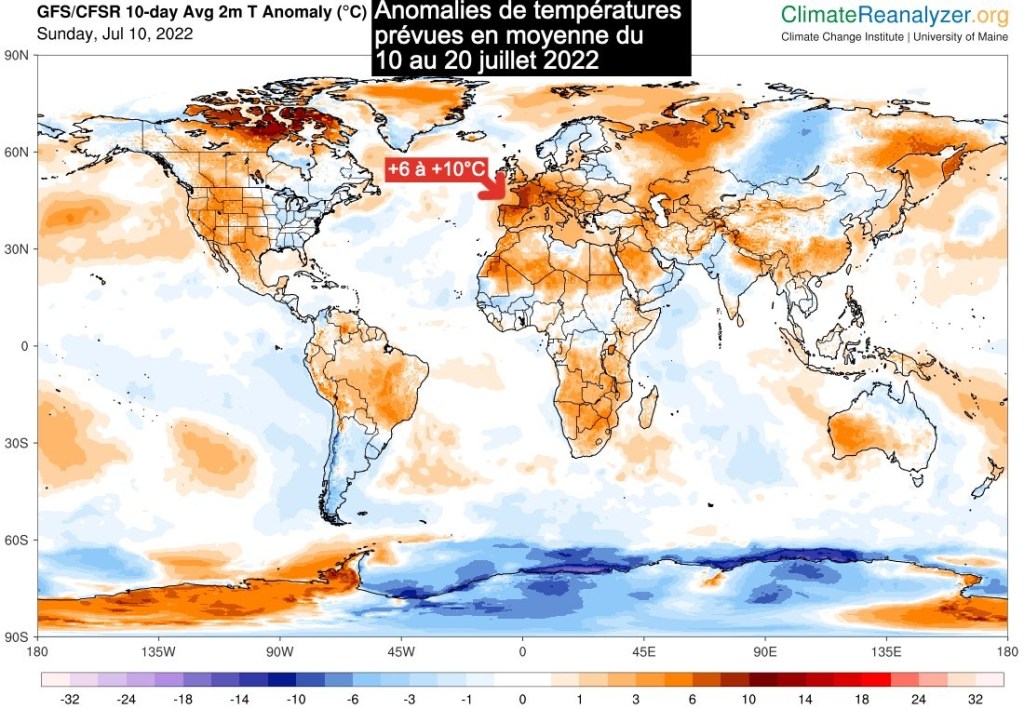 La carte en partage montre les prévisions d’anomalies de températures , qui indiquent que l’Ouest de la France sera l’une des régions du monde les plus touchées par une chaleur hors-norme dans les 10 prochains jours (excédents de +6 à +10°C en moyenne !).+10 à +15°C également dans le Nord du Canada.