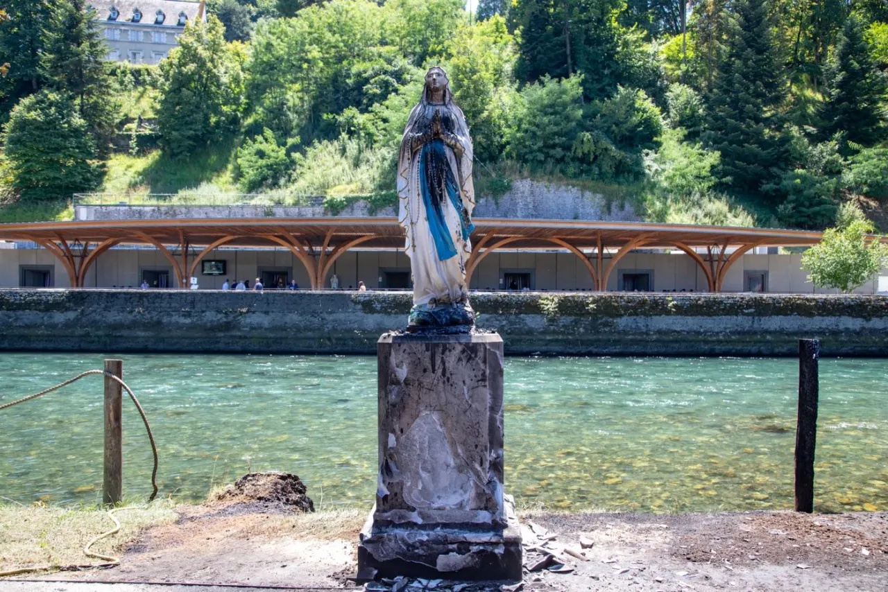 La statue de la Vierge Marie, située à côté des chapelles de lumière, noircie par les flammes.