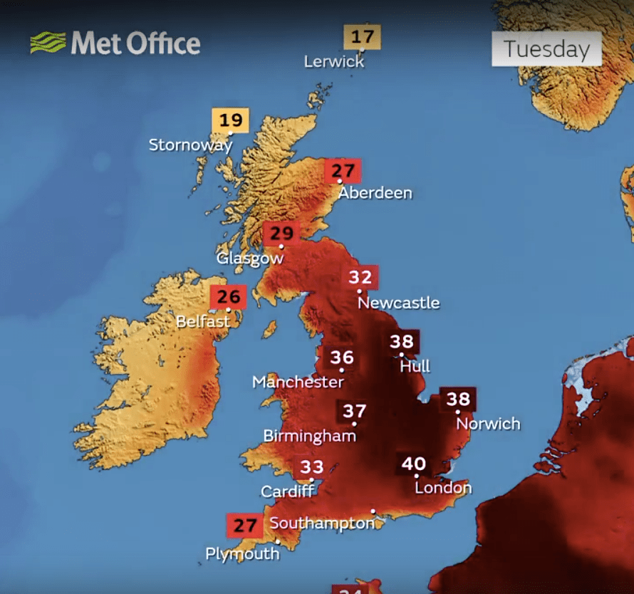 C’est la première fois que nous prévoyons 40°C au Royaume-Uni. La température record actuelle au Royaume-Uni est de 38,7 ° C, atteinte au Cambridge Botanic Garden le 25 juillet 2019.