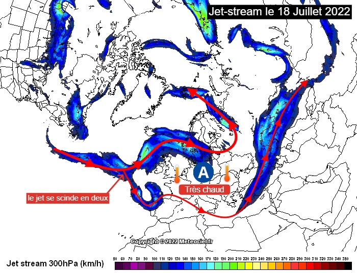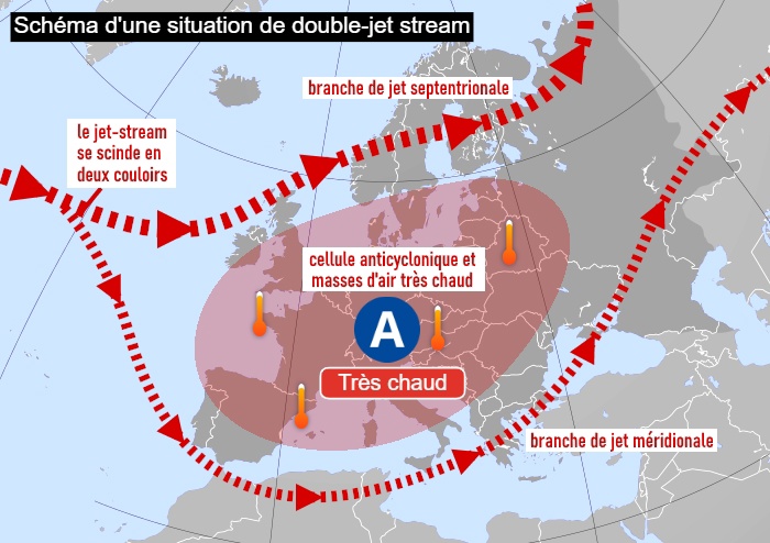 En Sandwich l’Europe , le courant Jet ou l’élément Air se divise en deux branches , et hop on piège une mase d’air chaud et on crée une cellule anticyclonique peu mobile car encadré par le courant jet..