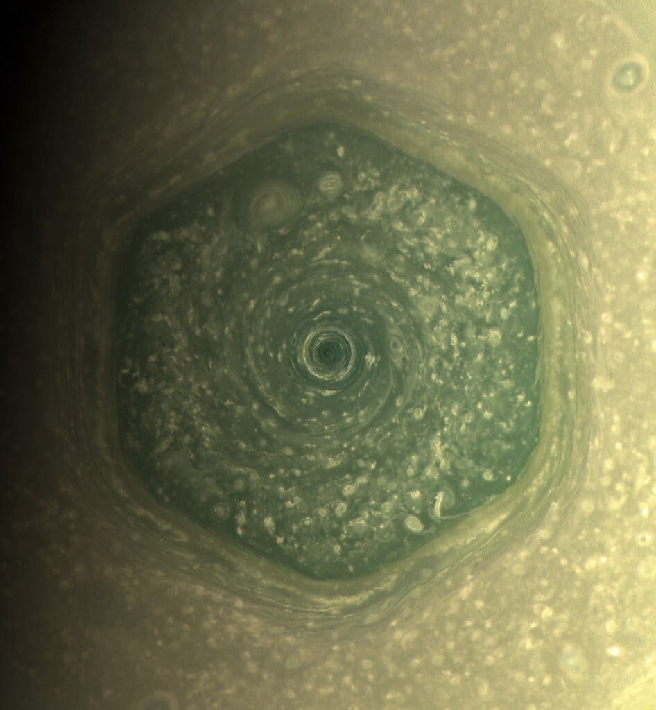 L’hexagone de Saturne est un motif nuageux hexagonal qui tourne en permanence au-dessus du pôle Nord à environ 78° N.