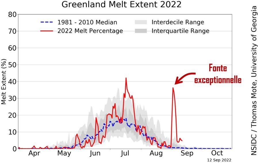 Un évènement de fonte exceptionnelle s’est produit au Groenland du 2-5 sept. Cette magnitude est inédite en septembre en 44 ans de mesures satellitaires, relarguant 16,3 milliards de tonnes d’eau à l’océan (en 4 jours).