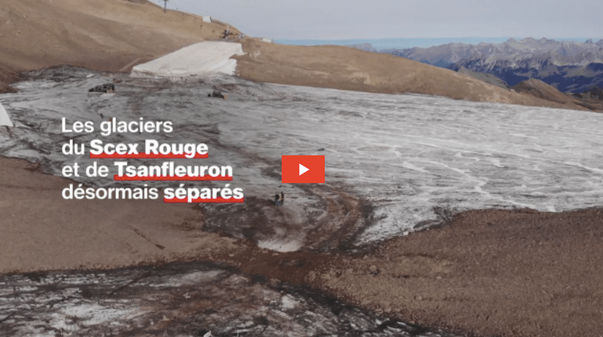 L’étroite portion de glace qui reliait encore les glaciers de Tsanfleuron et du Scex Rouge, sur le massif des Diablerets, a désormais totalement fondu, séparant définitivement les deux glaciers et laissant apparaître une langue de terre qui n’avait plus été à l’air libre depuis plus de 2000 ans.
