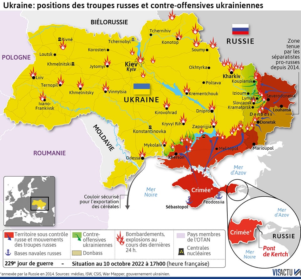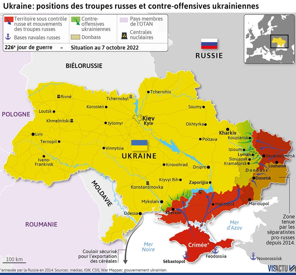 Sur la 1er carte du 7 Octobre , on voit les contres offensives Ukrainienne et les réponses Russe avec des renforts et mouvements de troupes venant par la Crimée..