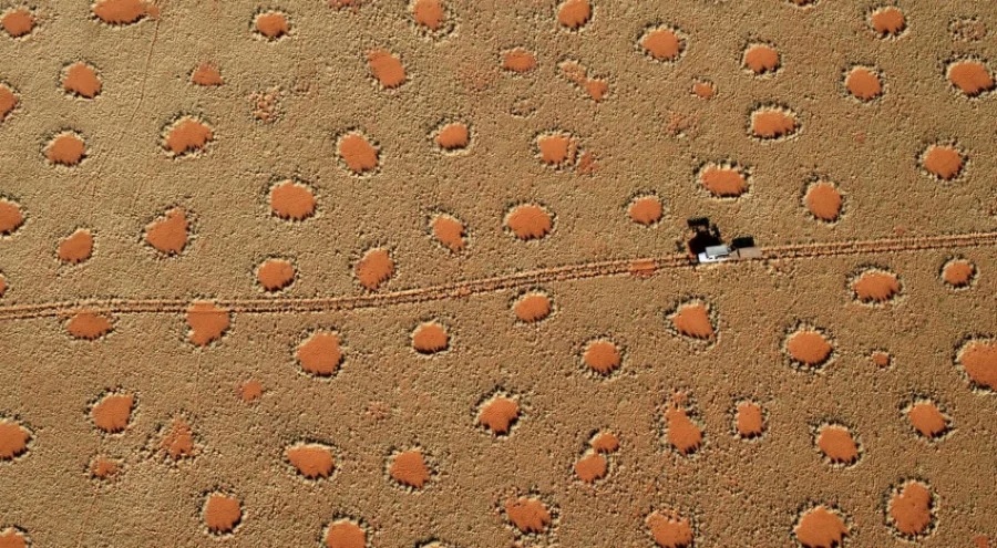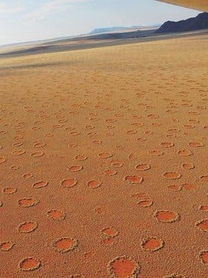 Ces cercles de sol nus entourés par un anneau d’herbe et pouvant atteindre plus de 15 mètres de diamètre s’aperçoivent du sud de l’Angola au nord de l’Afrique du Sud, majoritairement dans le désert de sable rouge de Namibie.
