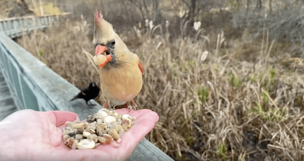 Oiseaux de la promenade ! La reine de la promenade, un Cardinal du Nord, arrive la première et sélectionne une pistache et une pépite de suif. Elle est suivie d’un carouge à épaulettes, d’un pic mineur houblonné et d’une mésange bicolore.
