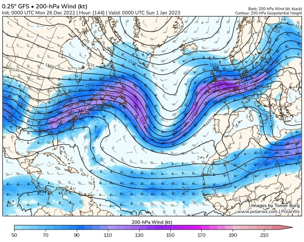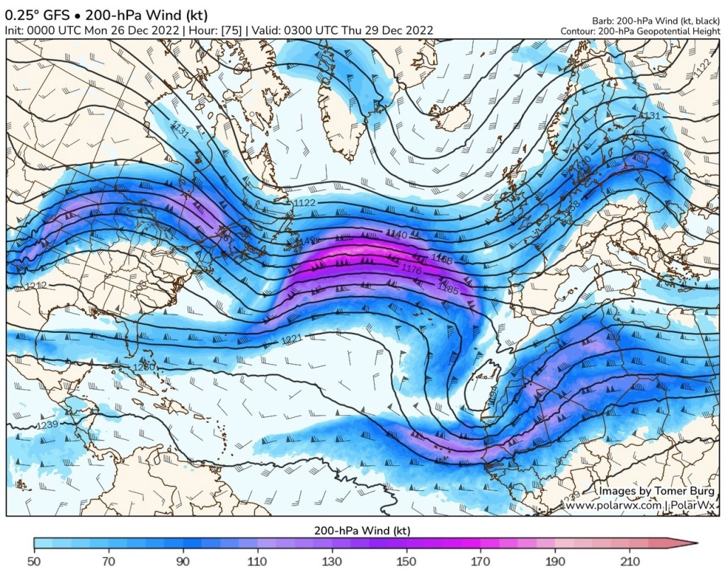 La position du jet Stream qui s’étend sur l’atlantique d’Ouest en Est avec des vents à pus de 280Km/h en atlantique pour les prochains jours va contribuer au défilé de perturbations en cette fin d’année sur la France.