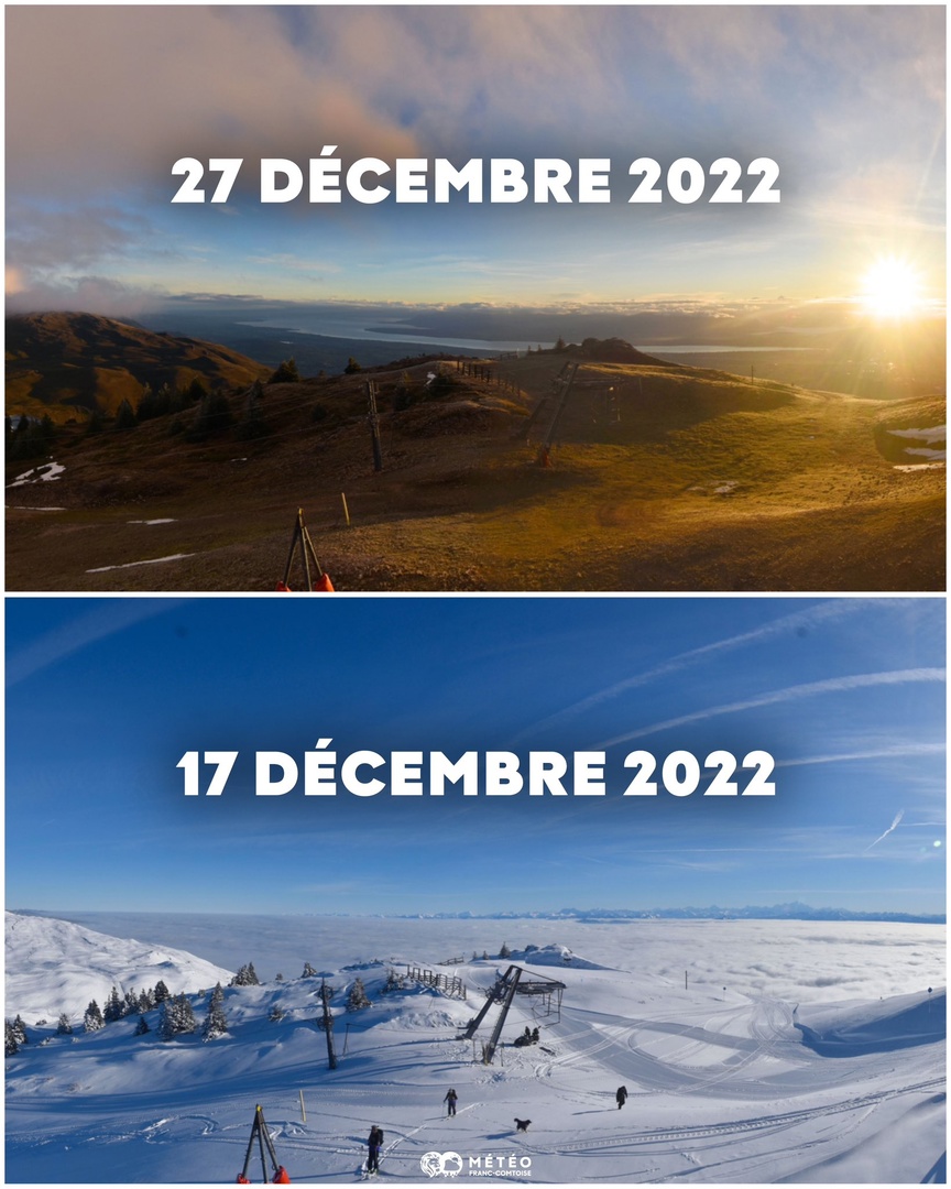 En 10 jours, le redoux pluvieux et les vents forts ont anéanti l’épais manteau neigeux à 1600 mètres d’altitude dans le Massif du Jura…
